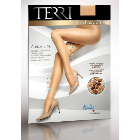 TERRI-SLIM Body 20 Den-Karcsusító Harisnyanadrág 20 denes karcsúsító harisnyanadrág. Koffein tartalma miatt csökkenti a narancsbőr kialakulását. Tökéletesen simul a lábra, kényelem és elegencia érzését biztosítja. Anyaga: 86% POLIAMID 14% ELASTAN