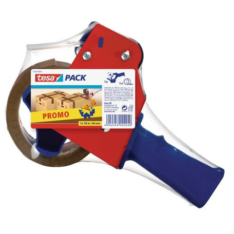 Csomagzáró gép, 48 mm x 50 m „Strong” csomagolószalaggal, TESA 57395 - mindenféle csomag biztonságos, tökéletes és kényelmes lezárásához - 50 mm tekercs szélességig használható - ajándék 48 mm x 50 m csomagolószalaggal szállítva (TESA „Strong” csomag