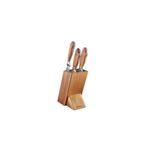 5 csúcsminőségű FEELWOOD kés masszív fa késtartóban. Kényelmes, keményített kőrisfából készült nyél és masszív „V“ profilú penge a tökéletes élért. Elsőosztályú japán rozsdamentes acél kovácsolásával és nemes fából k