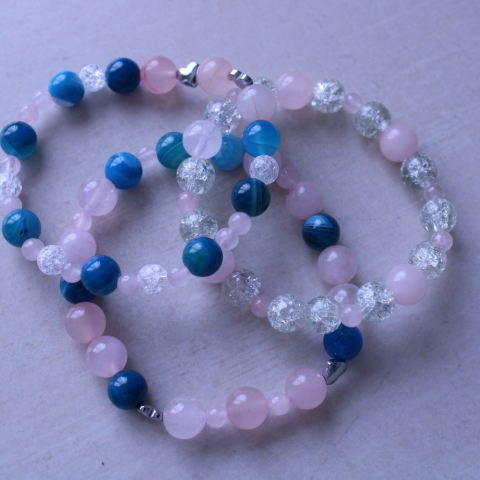 A szett az alábbi ásványokat tartalmazza: Természetes csíkos kék achát 8 mm, Rózsakvarc 4-8 mm, Repedt kristály 6 mm, Roppantott üveggyöngy Achát Az achátot már az ókorban ismerték és gyakran alkalmazták, mint védő és szerencsehozó amulett. Majd egyre