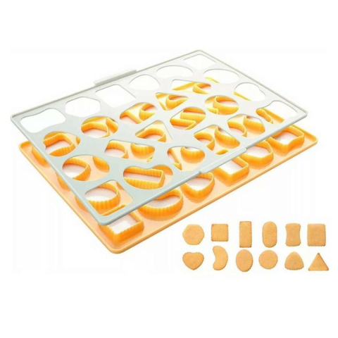 Tészta kiszúró rács, apró sütemény, műanyag, 23×33 cm A minőségű műanyagból készült formakeret segítségével egyszerre több különböző alakú tésztaforma kiszúrása lehetséges. A kiszúró mérete: 24×33 cm.