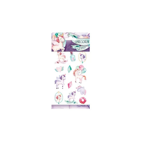 Korosztály: 3 - 6 év Tetoválás - Unikornis 2Gyermekeknek készült tetoválás utánzat, mely bőrre ragasztható. Kedvelt unikornis figurák láthatóak a képeken.Használati utasítás: vágja ki a kiválasztott képet. Távolítsa el az átlátszó filmréteget. Tegye a matricát a megtisztított, száraz bőrre. Nedves anyaggal áztassuk kb 30 másodpercig, míg a papírréteg könnyen