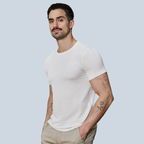 Slim Fit, törtfehér színű, magában mintás, kötött hatású póló, egyenes alsó szegéllyel Modell: 176 cm/ 75 kg/ M-es méret
