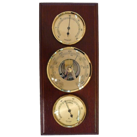 Barométer kombináció légynyomásmérő, hőmérő és páratartalom mérő Elforgatható műszerekkel, így függőlegesen és vízszintesen is rögzíthető! Dió színű hátlappal. Műszerek átmérője: 65/85mm Teljes mérete: 270x120mm Német minőség