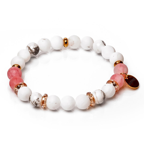 RUGALMAS KARKÖTŐ, a mérete választható. Az ékszer ásványai és tartozékai: – 8 mm-es fehér howlit gyöngyök – 8 mm-es matt fehér és rózsaszín jade gyöngyök – Arany színű fazettált üvegdíszek – M.King márkajelzésű nemesacé