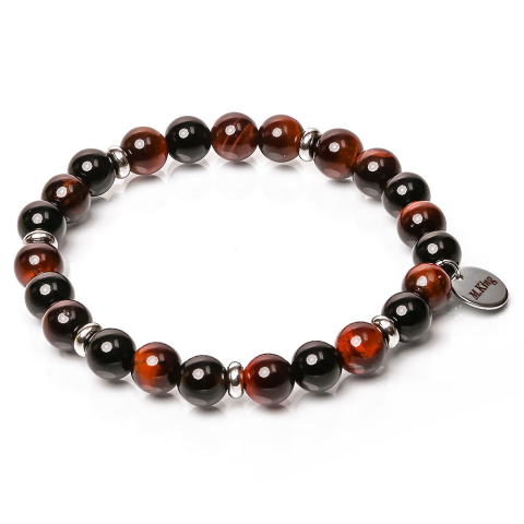 RUGALMAS KARKÖTŐ, a mérete választható. Az ékszer ásványai és tartozékai: – 8 mm-es vörösesbarna tigrisszem gyöngyök – 8 mm-es fekete csíkos achát gyöngyök – Ezüst színű díszek – M.King márkajelzésű nemesacél logóbiléta