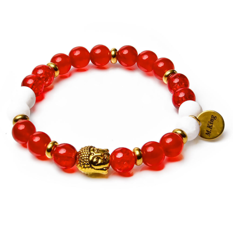 RUGALMAS KARKÖTŐ, a mérete választható.Az ékszer ásványai és tartozékai:– 8 mm-es matt fehér jade gyöngyök– 8 mm-es piros fényes jade gyöngyök– 8 mm-es piros roppantott hegyikristály gyöngyök– Arany színű fém díszek– Arany
