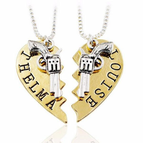 Különleges Thelma és Louise páros nyaklánc félszíves pisztolyos medálokkal, egyedi ajándék barátnőknek, BFF-eknek
