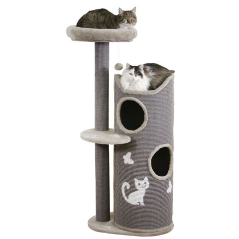 • magasság: 130 cm • alap mérete: 56 x 38 cm • három emeletes hengerrel: o 38 cm, magasság 98 cm • henger nagy sisal kaparófelülettel és két különálló belső párnával • 45 cm fekvőfelület kivehető ággyal • ágy és a belső párna kézzel mosható • párnázott fe