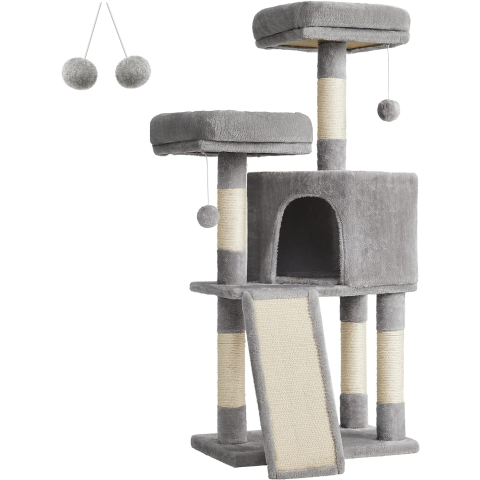 A TIGER macska kaparófa ideális hely a macskáknak, ahol játszhatnak, pihenhetnek és kaparhatnak. Ez a szürke-bézs árnyalatok kombinációjával készült modell stabil felépítésű és puha plüss bevonattal rendelkezik, amely biztosítja a kényelmet pihenés közben. A kaparóoszlopon több pihenőhely, egy ház és egy ferde szizál karcolóoszlop található, amelyek kielégítik a macskák természetes kaparási ösztönét.