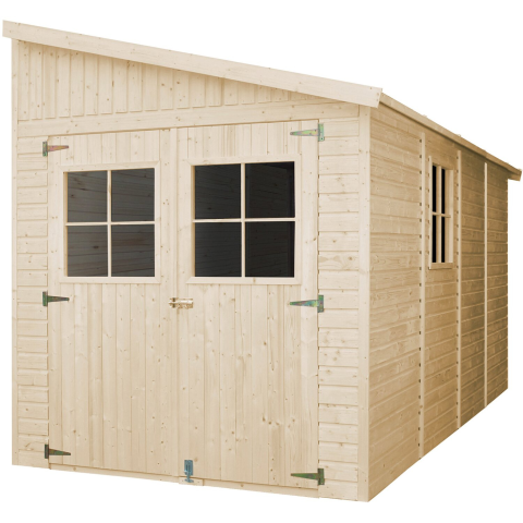 Az oldalfallal felszerelt, padló nélküli Timbela M340A 8 m2-es falhoz építhető fa kerti ház a tökéletes megoldás, ha tárolóhelyre van szüksége autói, szerszámai, kerékpárjai és kerti gépei számára. Az egyszerű összeszerelésnek, az északi lucfenyőből készült burkolatnak és a tartós tetőfedő bitumennek köszönhetően ez a kerti ház védelmet nyújt az időjárás viszontagságaival szemben, és szárazon tartja a holmiját. Ezenkívül kétszárnyú ajtókkal é