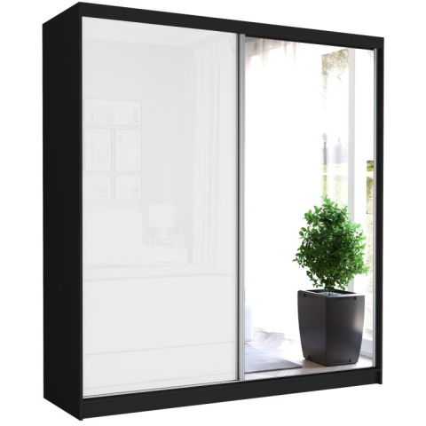 TIVARO V. Gardróbszekrény tükörrel és fehér üveggel - 203x218 cm - Fekete ✨ A TIVARO V. tolóajtós gardróbszekrény tökéletes megoldás, ha stílusos és praktikus tárolást keresel hálószobádba vagy gardróbodba. A modern design és a tágas belső tér garant...