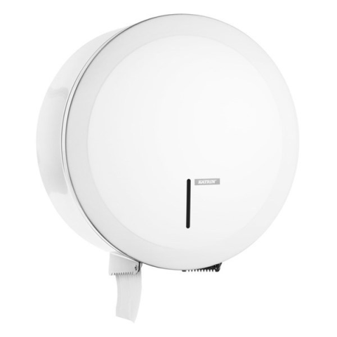 Toalettpapír adagoló tekercses KATRIN Gigant L maxi 23-28 cm fém fehér Elegáns ''L'' méretű toalettpapír (wc papír) adagoló, 23-28 cm-es toalettpapírokhoz. Anyaga: rozsdamentes acél, színe: fehér. Stabil és megbízható. A kis ablakon látható, hogy mik