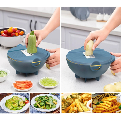 Többfunkciós zöldség -és gyümölcsszeletelő szett A többfunkciós szeletelő megkönnyíti a dolgodat az étel előkészítésénél. A zöldségek, vagy gyümölcsök egy szűrőtálba reszelhetők, majd a reszelő fedél levétele után könnyedén átmoshatod és leszűrheted ők