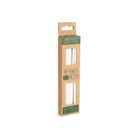 A Többször használatos bioműanyag kés készlet jellemzői: Erősített kivitel Mintás szár Komposztálható: Az evőeszköz komposztálható és biológiailag lebomlik Hideg és meleg ételek fogyasztására is alkalmas (70°C-ig) Anyaga: Növényi alapú bioműanyag és faliszt keveréke Szín: Fehér Méret: 170 x 15 mm Súly: 5 g / evőeszköz A csomag tartalma: 10 db Többször használatos bioműanyag kés
