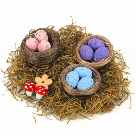 3db fészek dekoráció mini tojásokkal. Húsvétra illetve a tavaszi-nyári időszak kreatív alkotóinak díszeibe illeszthető kiegészítő. Méret: mag.: 2,5cm~, átmérő.: 6cm