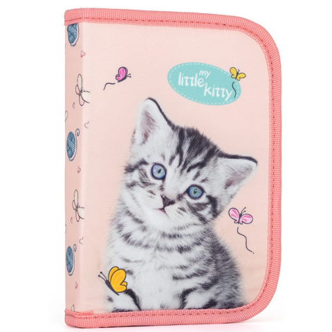 Egyszintes iskolai tolltartó, üres. 25 gumiszalagot tartalmaz az írószerek tartásához. A belső szárnyakon átlátszó fóliák vannak az órarendhez.