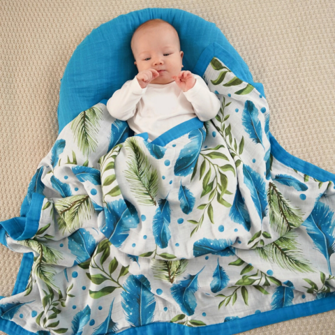 Öltöztesse babáját kényelembe és gyengédségbe. Ez a bambusz muszlin takaró maximális komfortot nyújt, gyönyörű toll- és levélmintával tervezve. 70% bambuszból és 30% pamutból készült, ideális a forró napokra légáteresztő és hűvös érzete miatt.