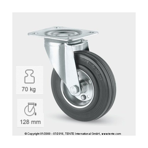 Préselt acéllemez villaszerkezet, cinkkromátozott, dupla golyósoros csapágy a nyakban, porvédő, csavarozott tengely. Kerék: préselt acéllemez keréktárcsa, fekete gumi futófelület, tűgörgős csapágy. Kerékátmérő: 100 mm Teherbírás: 70 kg (dinamikus) 3370DVR