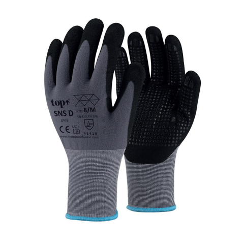 TOP SNS-D homokszemcsés nitril habba ujjvégig mártott védőkesztyű, tenyerén nitril pontozással.Tulajdonságai: Kevertszálas alapú. Homokszemcsés nitril habba, ujjvégig mártott. Kiváló fogásbiztonság, tenyerén nitril pontozás. Szellőző kézhát. Csúszásb