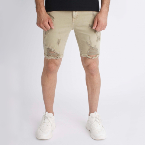 Skinny fit szabású, szaggatott bézs színű rövidnadrág, 4 zsebbel és cipzáras sliccel Modell: 185 cm / 85 kg / 33-as méret