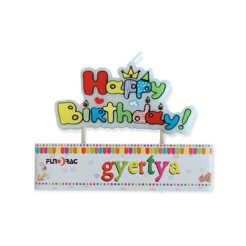 Születésnapi tortagyertya Happy Birthday felirattal.
