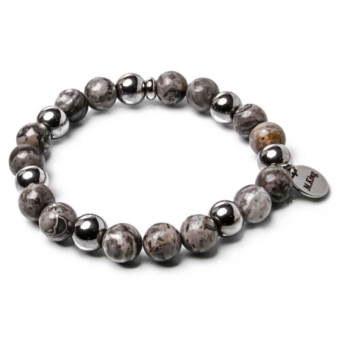 RUGALMAS KARKÖTŐ, a mérete választható.Az ékszer ásványai és tartozékai:– 8 mm-es térkép jáspis ásványok– 8 mm-es ezüst színű hematit ásványok– M.King márkajelzésű nemesacél logóbiléta.– Technika: rugalmas, tartós