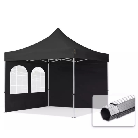 1 kép TP 3x3m összecsukható 800N alumínium pavilon, 2 db oldalfallal, hagyományos ablakkal - fekete