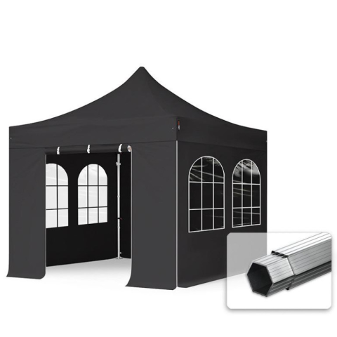1 kép TP 3x3m összecsukható 800N alumínium pavilon, 4 db oldalfallal, hagyományos ablak - fekete