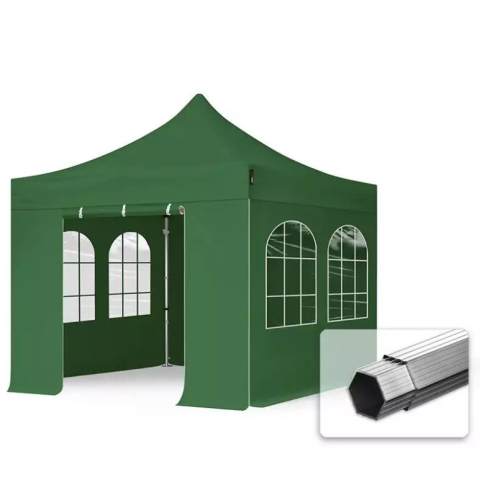 1 kép TP 3x3m összecsukható 800N alumínium pavilon, 4 db oldalfallal, hagyományos ablak - zöld