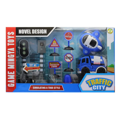 Rendőrségi játékszett táblákkal, kisrepülővel és kisteherautóval.