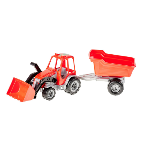 Információk Traktor rakodóval és pótkocsival - 138A típusú traktor széles mobil rakodógéppel a játék elején és egy levehető pótkocsival hátul. A hátrabillenthető kék pótkocsi egytengelyes alvázra került. A készlet mozgatható elemekkel rendelkezik, amel