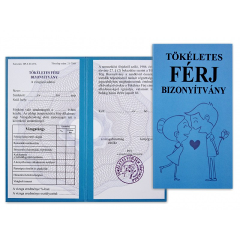 Vicces, tréfás bizonyítvány, Tökéletes férj Személyre szólóan értékelhető Anyaga: papír, karton Befoglaló mérete: 11 x 0,5 x 24 cm