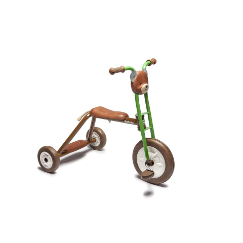 Nagyobb, óvodás korosztályú 4-6 éves gyerekeknek ajánlott masszív tricikli környezettudatos kialakítású, fa bázisú kényelmes, ergonómikus hosszú formázott üloke