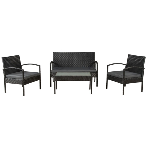 Az időtlenül modern polirattan ülőgarnitúra, a Trinidad fekete szürke huzattal 4 személy számára kínál kényelmes ülőhelyet a szabadban. A 4 részes kerti bútorkészlet egy kanapét, két fotelt és egy elegáns üveglappal ellátott asztalt tartalmaz. Akár a kert