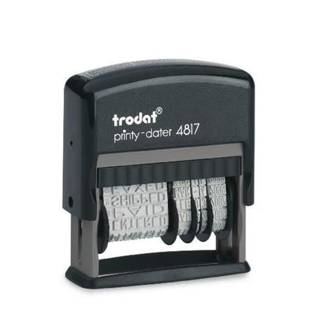 Dátum- és szövegbélyegző, 12 féle szöveggel, TRODAT 4817 - önfestékező rendszer - szövegablak a szavak kiválasztásához - a beállított szó a dátummal egy sorba kerül - az évszalag 12 évig használható - karaktermagasság: 3,8 mm - A bélyegzőn beállít