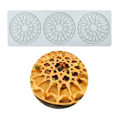 A szilikon forma teljes mérete: 12,5 cm × 36 cm A minta méretei: 11 cm átmérő A forma mélysége: 2,5 mm ️ Használati tippek: Tésztakészítés: klasszikus tuile-tészta – vaj, méz, tojásfehérje, liszt Töltés és sütés: töltsd meg a formát, süsd 8–