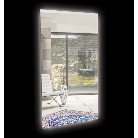 Négyszögletű tükör LED világítással kapcsoló nélkül, 60x100 cm méretben. A világítás színhőmérséklete 6000 K (hűvösebb fehér). IP44-es védettséggel, fröccsenő víz ellen védett. A tükör tájolása függőlegesen és vízszintesen.