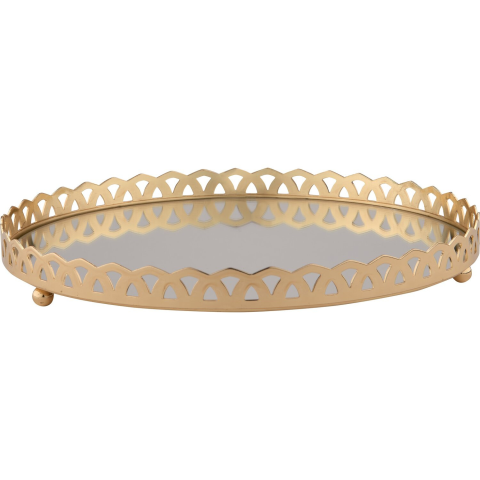 A Dark Wonder kollekció tálcája díszítésre és tárolásra szolgál. Az üvegből és fémből készült tálca tükrös aljjal és finom kivitelezéssel rendelkezik. Ideális gyertyatartókhoz, figurákhoz vagy vázákhoz. A tálca színe nemes arany. Átmérője 28 cm, magassága 3,5 cm.