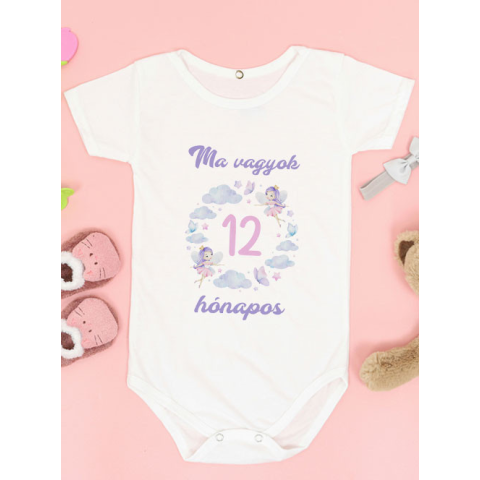 Boldog első szülinapot! Ünnepeld meg ezt az egyéves mérföldkövet egy különleges tündéres bodyval, amelyen a Ma vagyok 12 hónapos felirat és egy születésnapi hangulatú grafika szerepel. Tökéletes ajándék, emlék és fotózási darab a legnagyobb pillanathoz.