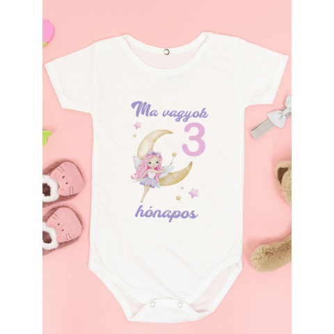 Ma vagyok 3 hónapos feliratos body egy csodaszép holdon ülő tündért ábrázol. A testhezálló, 100% pamut anyagú, fehér babaruha rövid ujjú és patentos kialakítású. Egyedi meglepetés, amely ideális fotózáshoz vagy szívhez szóló ajándéknak. Anyagtípus: 10