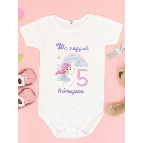 Ma vagyok 5 hónapos feliratos body szivárványos tündér grafikával igazi meseszerű darab. A pasztell árnyalatok és a pihe-puha, 100% pamut anyag együttese garantáltan kényelmet nyújt babádnak. Egyedi ajándékötlet babalátogatásra vagy fotózásra. Anyagtí