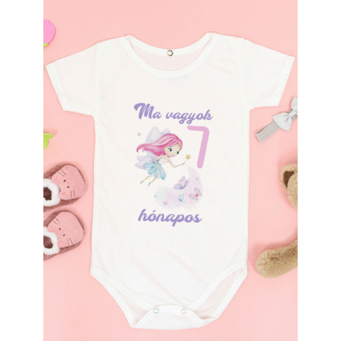 A hetedik hónapban egy pillangókkal körülvett tündér vigyázza kisbabád fejlődését. A Ma vagyok 7 hónapos felirat mellett a pasztell árnyalatok teszik igazán meséssé ezt a fehér, 100% pamut bodyt. Tökéletes meglepetés, fotózási kellék és örök emlék. An