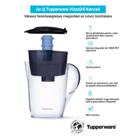 Termékjellemzők: - Tupperware Vízszűrő Kancsó. - A készlet tartalma: Vízszűrő kancsó, 2,6 liter, Újratölthető vízszűrő betét. - Figyelem! A cseréklhető aktív szenes granulátum NEM tartozék, külön lehet megvásárolni! Egy granulátum 150 liter víz szűré