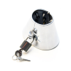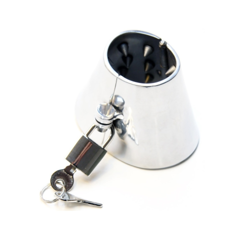 Tüskés herepánt.Rozsdamentes acélból készült.Nagyon szépen csillogóra felpolírozva kívülről.Szétnyitható.Lakat tartozék-2kulyccsal.Magassága:8,5cm.Átmérő(kisebb):4x4,5cm.Átmérő(nagyobb oldal):6x8cm.