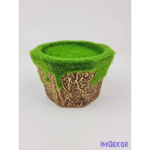 Magassága 7,5cm, felső átmérője 12cm, alsó átmérője 9cm. Hungarocell béléssel ellátott, tűzhető, szúrható műfűvel borított cserép.