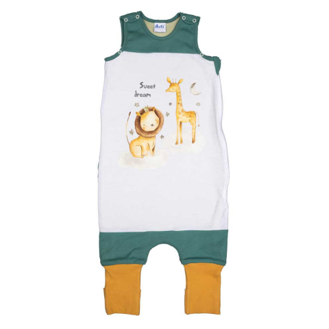 Ujjatlan tipegő hálózsák Szafaris mintával 2 TOG Egy igazi kis kalandra indulhat a gyermeked ezzel a gyönyörű, zöld színű cuki szafaris mintával nyomott tipegő hálózsákkal. Az ujjatlan, vállon patentos, oldalán szétcipzározható, 2 ré
