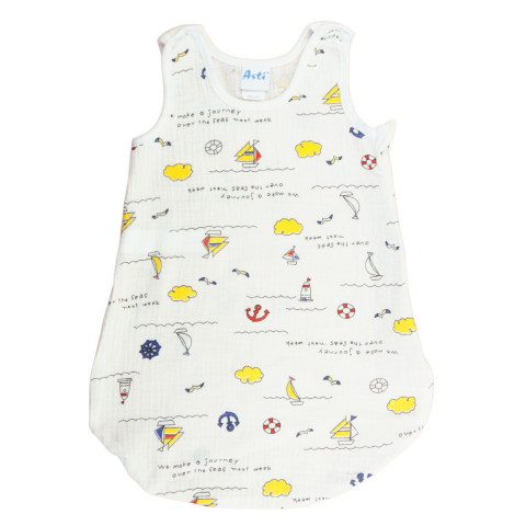 Ujjatlan vékony hálózsák Vitorlás mintával 1 TOG Öltöztesse álomba kisbabáját ebben a könnyű vékony duplagéz anyagból készült vitorla mintás, ujjatlan hálózsákban! Az oldalt cipzáras, vállon patentos kialakításnak köszönhetően könnyedén felvehető és leve
