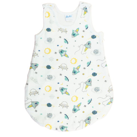 Ujjatlan vékony tetra hálózsák Ürhajós mintával 1 TOG Öltöztesse álomba kisbabáját ebben az ürhajó mintás, ujjatlan hálózsákban! Az oldalt cipzáras, vállon patentos kialakításnak köszönhetően könnyedén felvehető és levehető, így az éjszakai pelenkázás se