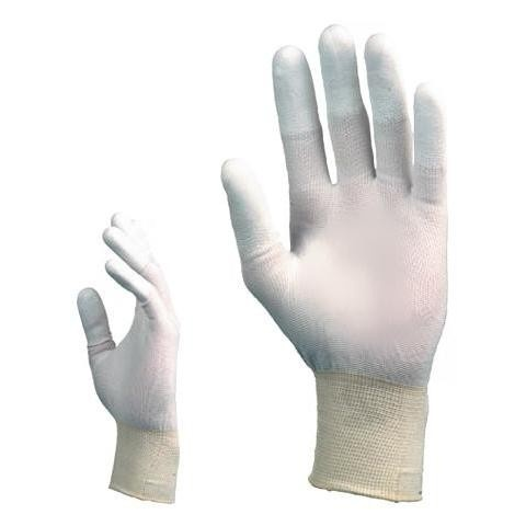 UJJBEGYEN POLIURETÁN MÁRTOTT KESZTYŰ_10 Fehér, varrás nélküli, poliészterrel erősített, 13-mas kötésű kesztyű. Fehér poliuretán ujjbegyben mártott. Kötött mandzsetta